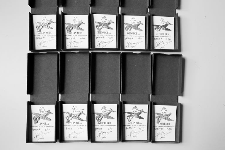 The day after a passenger plane was deliberately crashed by its pilot, Antwerp-based contemporary jewelry maker Peter Vermandere translated his growing latent fear of flying into this little creation. With time passing, the fear faded, and the creation silently became part of the kabinet of curiosities which is his atelier... Until the moment when we discovered it while visiting the wondrous place after a chance meeting the night before. Peter decided to create a series of pins out of the crashing plane especially for us, which we named 'Aviophobia'. It taught us that some birds happen to fall a little longer than others, but they will fall in the end.